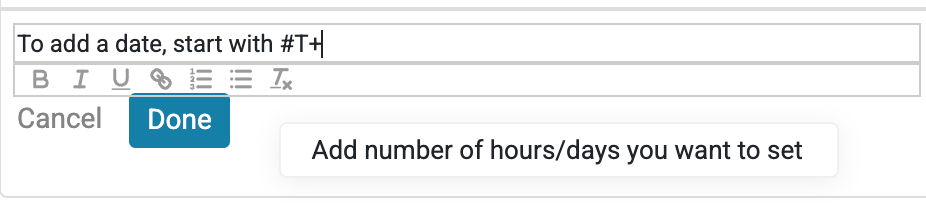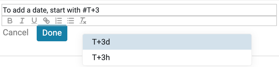 - When creating or editing a template, add a relative date or time by typing #T+ (T = Today, which become the day the template is added to a wiki). You will then get prompted to add the number of days or hours in the future you want to specify.