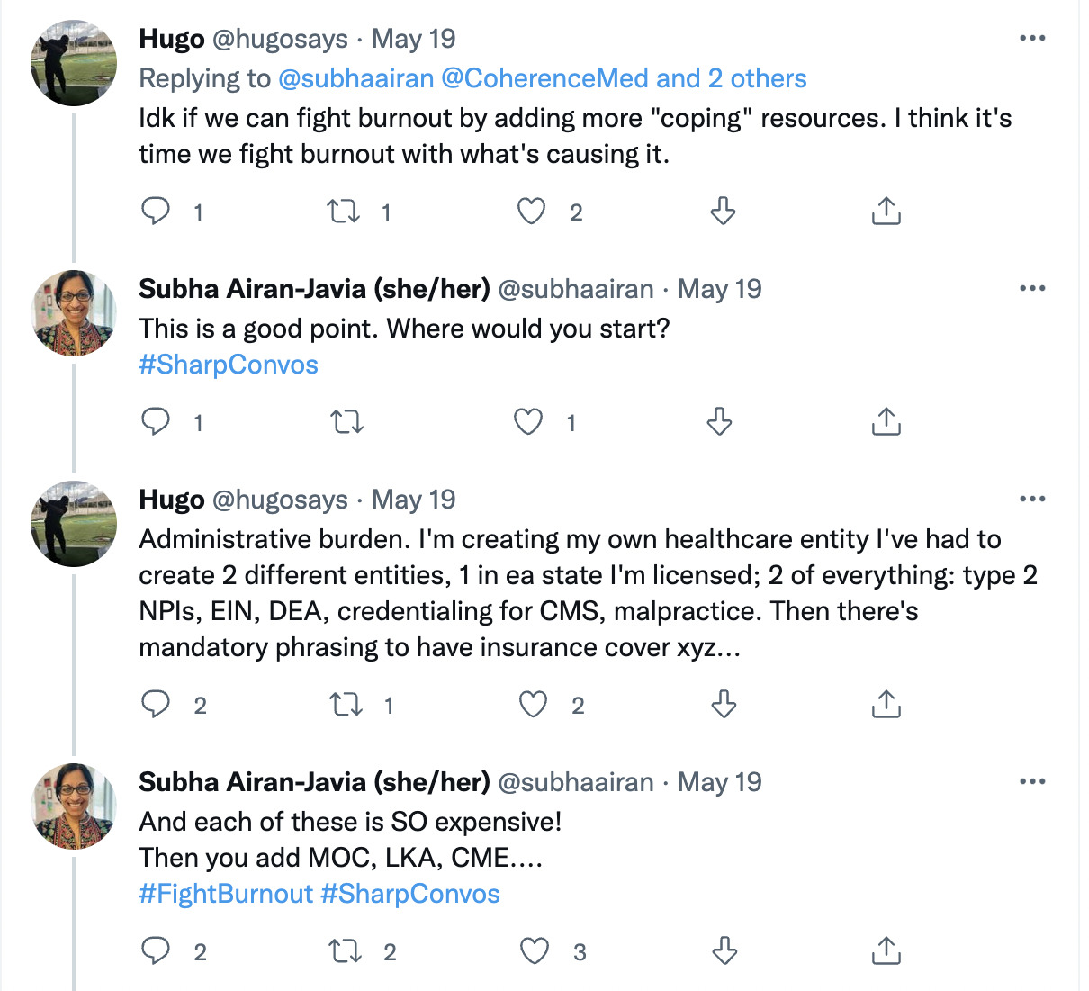 Sharp Conversations is a video interview series co-hosted by Subha Airan-Javia, MD, FAMIA and Janae Sharp. These are real conversations with experts in healthcare fighting to end clinician burnout. Watch previous videos on YouTube, and stay tuned for more interviews.